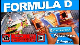 Formula D est un jeu de course à hauts risques inspiré de la Formule 1, dans lequel les joueurs pilotent des voitures simulées dans l’espoir de franchir la ligne d’arrivée en premier. Il s’agit d’une réédition de Formula Dé, avec plusieurs changements. Les anciens circuits restent compatibles, mais les nouveaux plateaux proposent un circuit F1 d’un côté et un circuit urbain de l’autre, ces derniers ajoutant des éléments thématiques originaux.