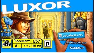 Dans Luxor, les joueurs déplacent leurs aventuriers dans le temple afin d’atteindre le tombeau central. Au départ, chacun reçoit cinq cartes dont l’ordre est figé. À chaque tour, on joue la carte située à l’une des extrémités de sa main pour avancer un aventurier d’autant de tuiles, puis on applique l’effet de la tuile atteinte, qu’il s’agisse de récupérer des trésors, obtenir une clé ou une carte Horus, profiter d’un déplacement accéléré, gagner des bonus ou emprunter des tunnels créant des raccourcis. On complète ensuite sa main en piochant une carte placée au centre. De nouveaux aventuriers peuvent rejoindre l’équipe en cours de partie. La fin est déclenchée lorsque deux aventuriers atteignent le tombeau, à condition de posséder les clés nécessaires. Après le décompte final, le joueur totalisant le plus de points l’emporte.
