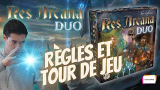 Res Arcana Duo est à la fois une extension pour Res Arcana, avec environ trente-cinq pour cent de cartes supplémentaires, et un jeu autonome conçu pour deux joueurs, pouvant ensuite être combiné avec Res Arcana ainsi qu’avec ses autres extensions Lux et Tenebrae et Perlae Imperii.