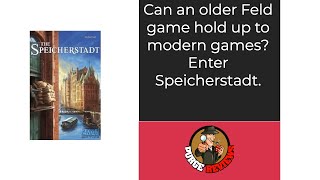 Speicherstadt est un jeu de cartes d’enchères dans lequel les joueurs s’affrontent pour obtenir des points de victoire, principalement grâce aux contrats, qui sont des ensembles de ressources, et aux cartes spéciales, comme une série complète de bureaux de comptage identiques ou les récompenses liées aux cartes Bateau. Le jeu repose sur deux principes centraux. Les joueurs enchérissent sur les cartes en construisant des tours avec leurs meeples. Chaque meeple augmente le coût de la carte, mais uniquement pour les joueurs placés en dessous. Il faut donc choisir avec soin le moment où l’on place un meeple sur une carte et celui où l’on s’en sert pour renchérir le prix payé par les autres, d’autant plus qu’un joueur ne peut faire que trois enchères par manche. Par ailleurs, les joueurs subissent des points négatifs s’ils négligent de collecter des cartes Pompiers, ce qui peut coûter la victoire. Ce mécanisme punitif est caractéristique de l’auteur Stefan Feld.